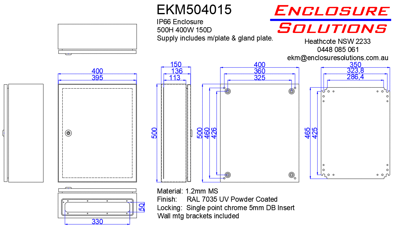 | EKM504015 500H 400W 150D Industrial electrical enclosure steel metal box cabinet switchboard, IP66, RAL 7035 Grey | Specifications |